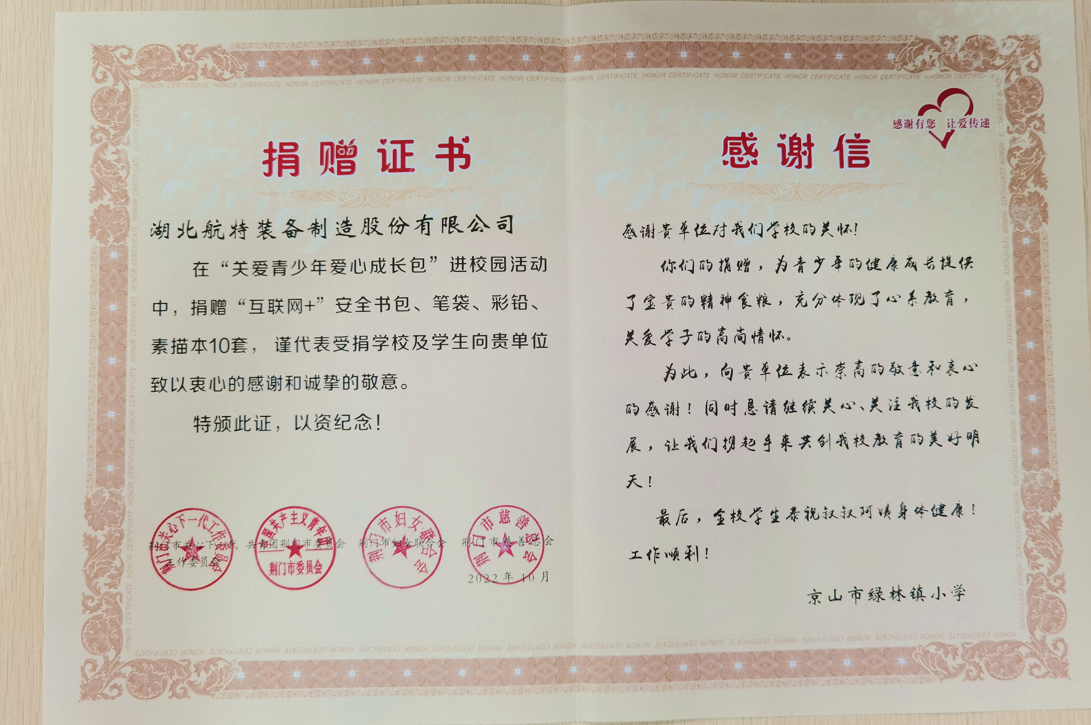 積極支持國(guó)家扶貧戰(zhàn)略,相繼為漳河鎮(zhèn)袁沖村、麻城鎮(zhèn)鄧沖村和市健康扶貧醫(yī)療基金捐款25萬(wàn)元;為京山市綠林小學(xué)捐贈(zèng)愛心成長(zhǎng)包;2020-2022三年疫情期間,在保障員工基本利益的情況下,力保主要客戶供貨,同時(shí)為客戶、社會(huì)捐贈(zèng)愛心款和防疫器材,彰顯航特?fù)?dān)當(dāng)。